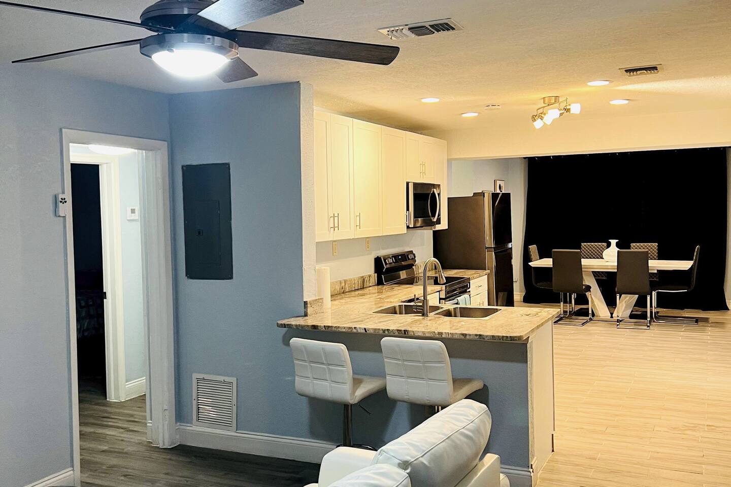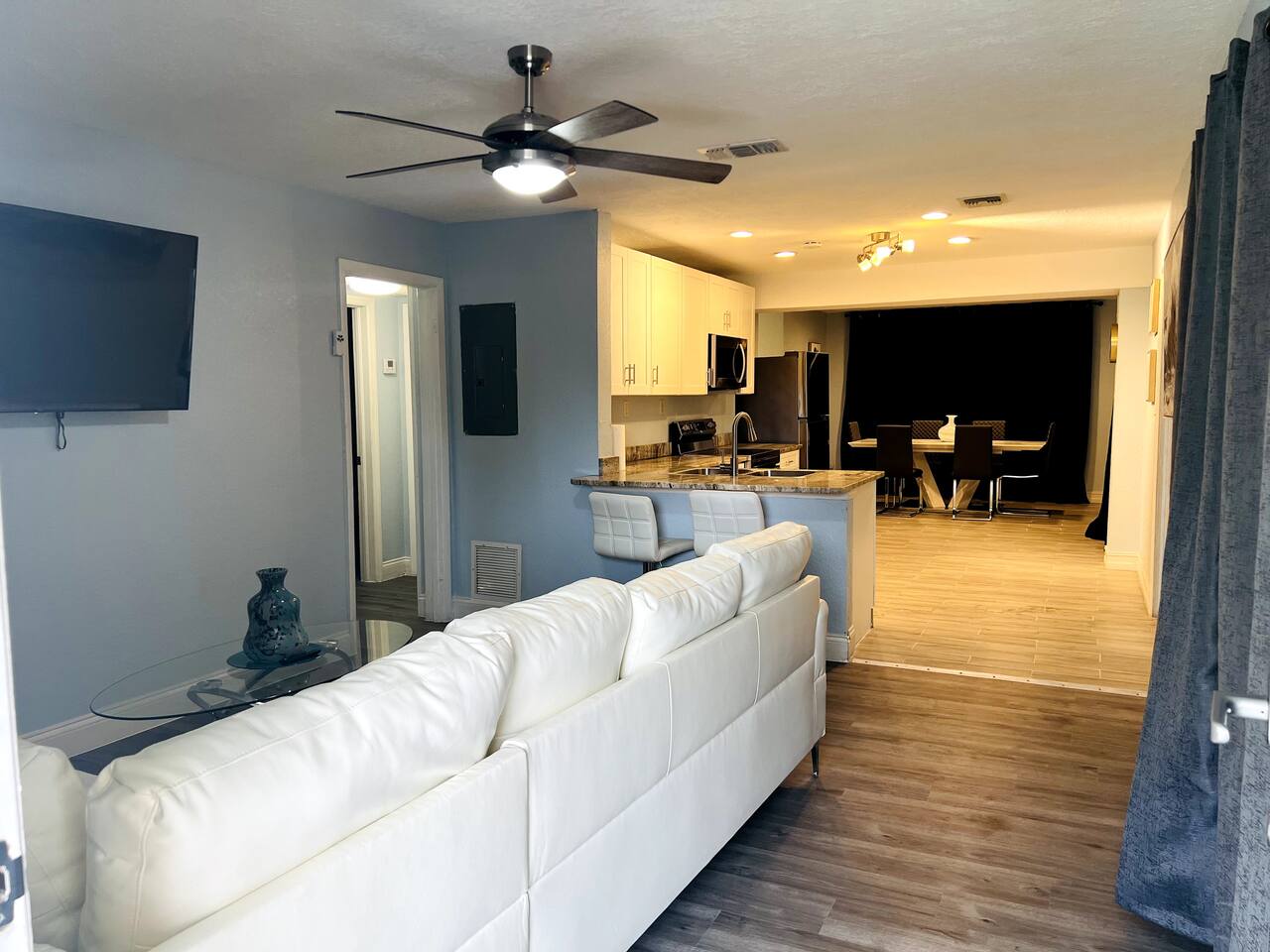 This stylish and spacious home is perfect for group trips! This is a 3 bedroom modern home that is conveniently located near downtown Orlando, Camping World, Orlando Amphitheatre and other major attractions! This home comes with a bonus room known as the "Sky Room" adding additional space for your family to relax and enjoy the property.